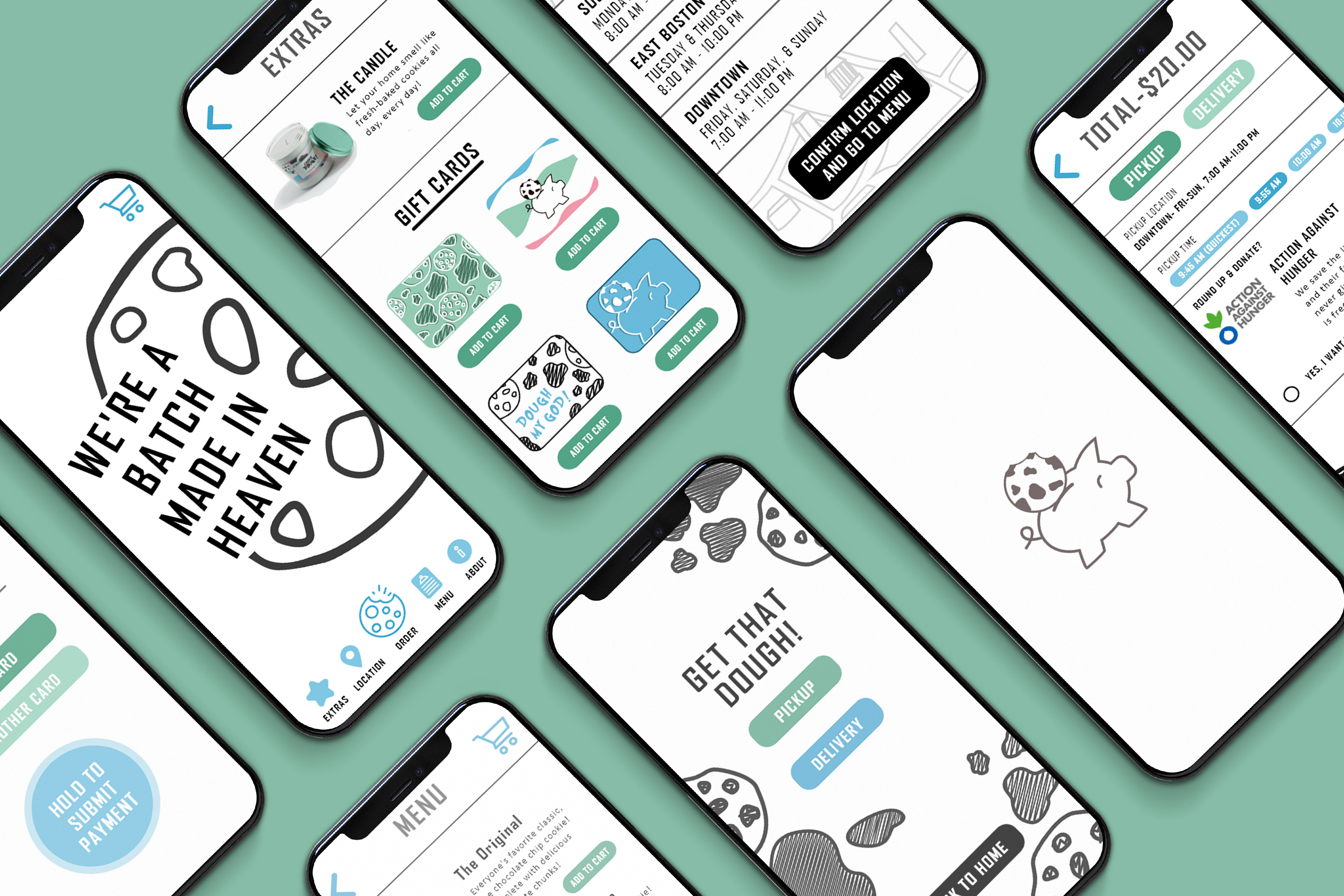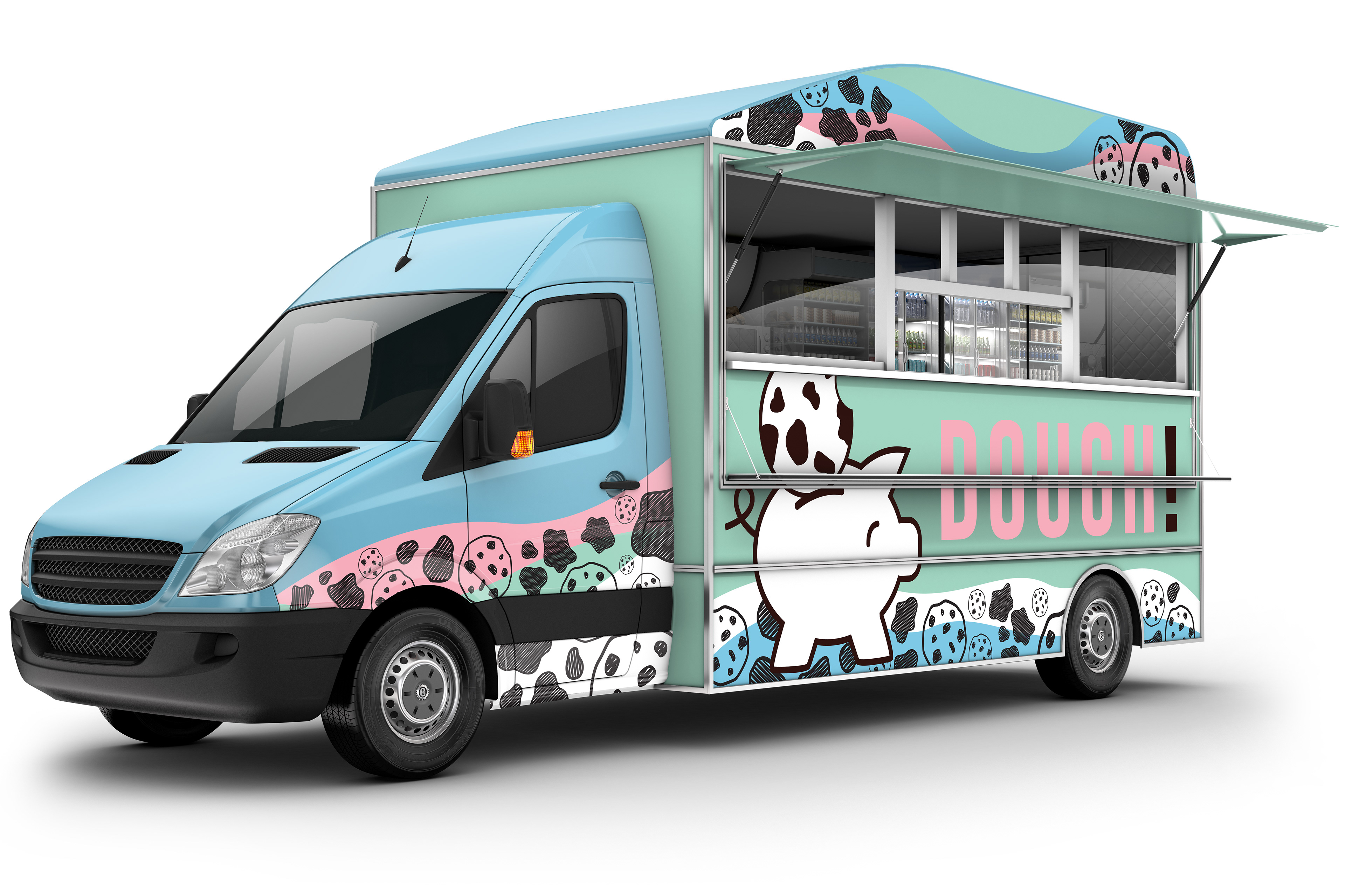 This is a brand identity and app design project for an edible cookie dough truck called Dough!. Cookie dough is an exciting, heartwarming treat for all ages, and I wanted the brand to reflect that warmth and happiness. The sketchy illustrations seen throughout the truck elicit a sense of childhood fun, and the pastel colors create a calming and soothing vibe. Furthermore, the cartoon style of the logo continues the carefree and welcoming energy.